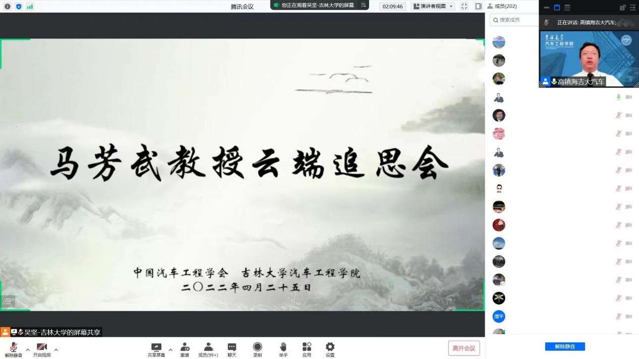 2022年4月21日,FISITA技术领导力会士、SAE International会士、中国汽车工程学会会士、《Automotive Innovation》执行主编、beat365亚洲体育官方网站工程学院马芳武教授因病在长春逝世。为在疫情期间做好马芳武教授的悼念活动,4月25日,中国汽车工程学会、beat365亚洲体育官方网站在腾讯会议平台联合举办云端追思会。来自beat365亚洲体育官方网站、汽车行业学会、企事业单位、海内外校友代表,以及马芳武教授的亲朋、同事、同学、学生等近四百人共同缅怀追思。会议由beat365亚洲体育官方网站院长、汽车仿真与控制国家重点实验室主任高振海主持。
