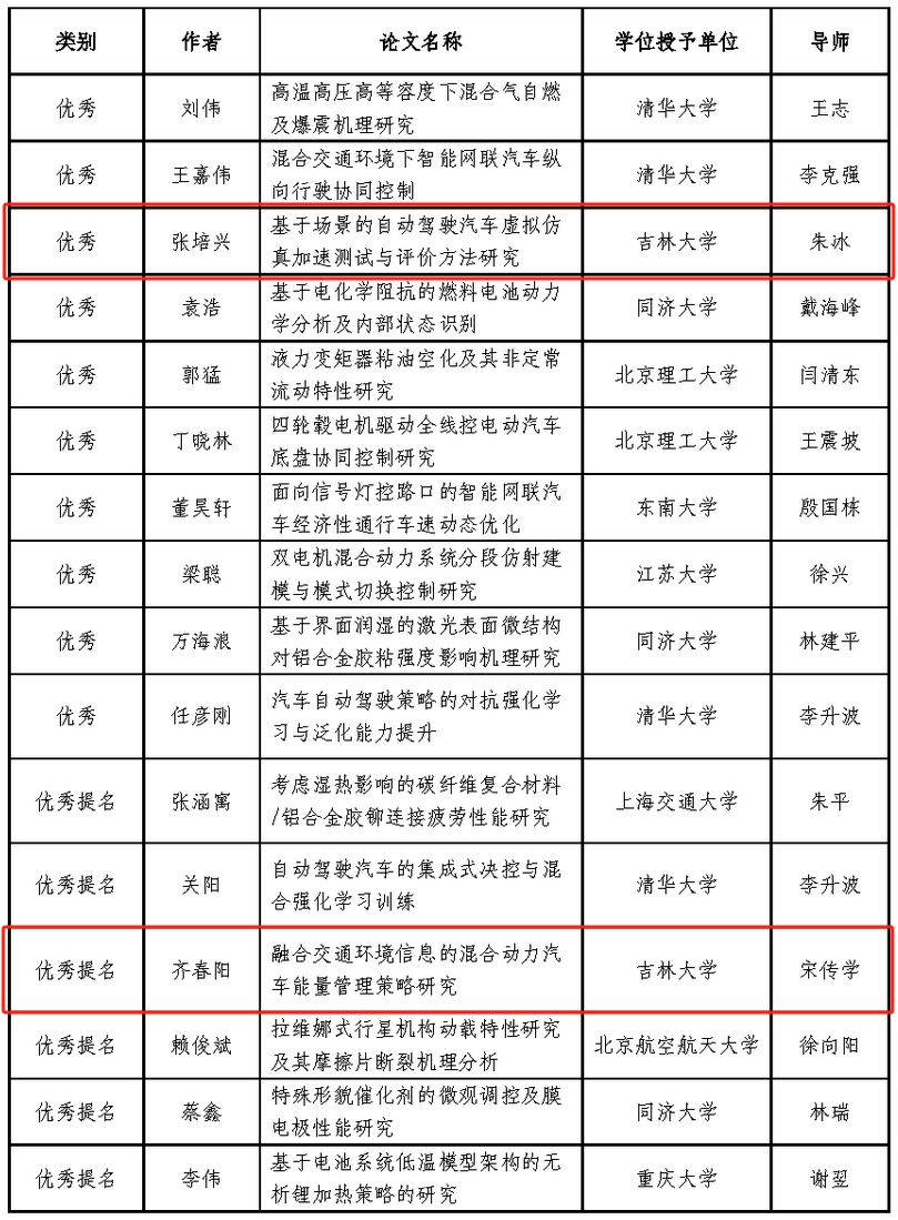 beat365亚洲体育官方网站朱冰教授指导的张培兴博士毕业论文《基于场景的自动驾驶汽车虚拟仿真加速测试与评价方法研究》荣获“优秀博士学位论文”,宋传学教授指导的齐春阳博士毕业论文《融合交通环境信息的混合动力汽车能量管理策略研究》荣获“优秀博士学位论文提名”。