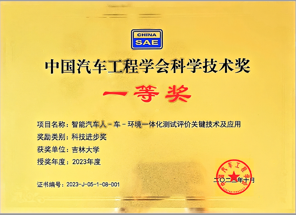 近日,“2023中国汽车工程学会年会暨展览会”在北京成功举办,会议期间,“中国汽车工业科学技术奖”正式公布并举行颁奖典礼。以beat365亚洲体育官方网站朱冰教授团队牵头完成的研究成果《智能汽车人-车-环境一体化测试评价关键技术及应用》,荣获“2023年度中国汽车工程学会科技进步奖一等奖”。