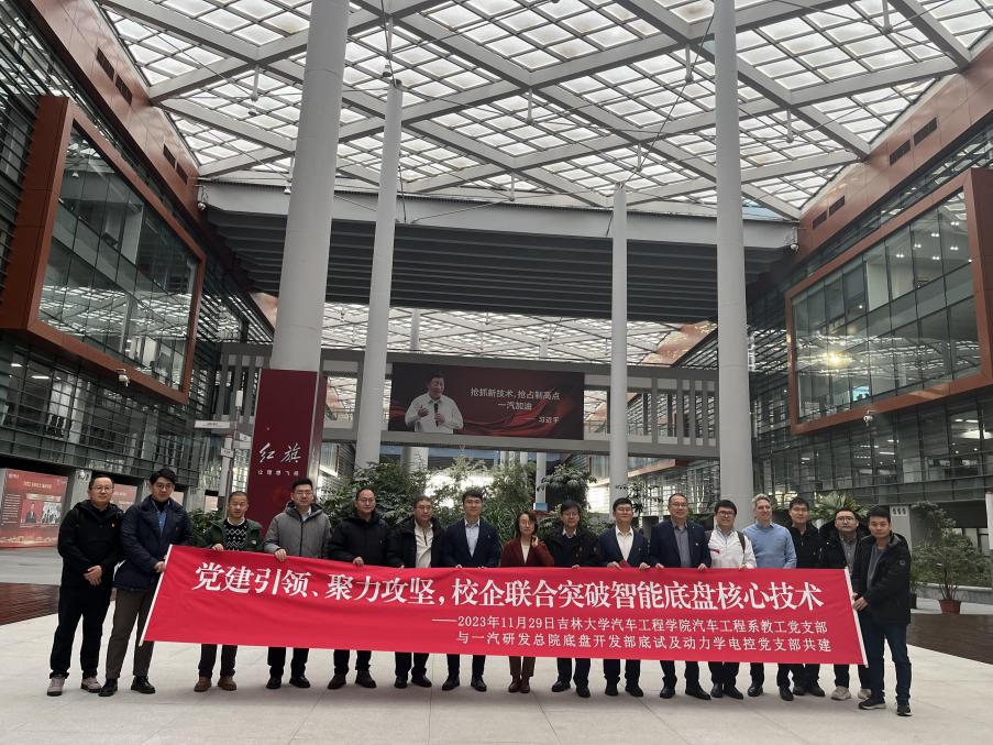 2023年11月29日,beat365亚洲体育官方网站汽车工程系教工党支部赴一汽研发总院底盘开发部底试及动力学电控党支部,以“党建引领、聚力攻坚、校企联合突破智能底盘核心技术”为主题开展支部共建活动。beat365亚洲体育官方网站党委书记黄忠华、副院长朱冰、汽车工程系教工党支部书记李建华等10余位党员与一汽研发总院底盘开发部首席设计师侯杰、部长禹真与底试及动力学电控党支部书记李论、组织委员王伟等10余位党员共同出席了活动。