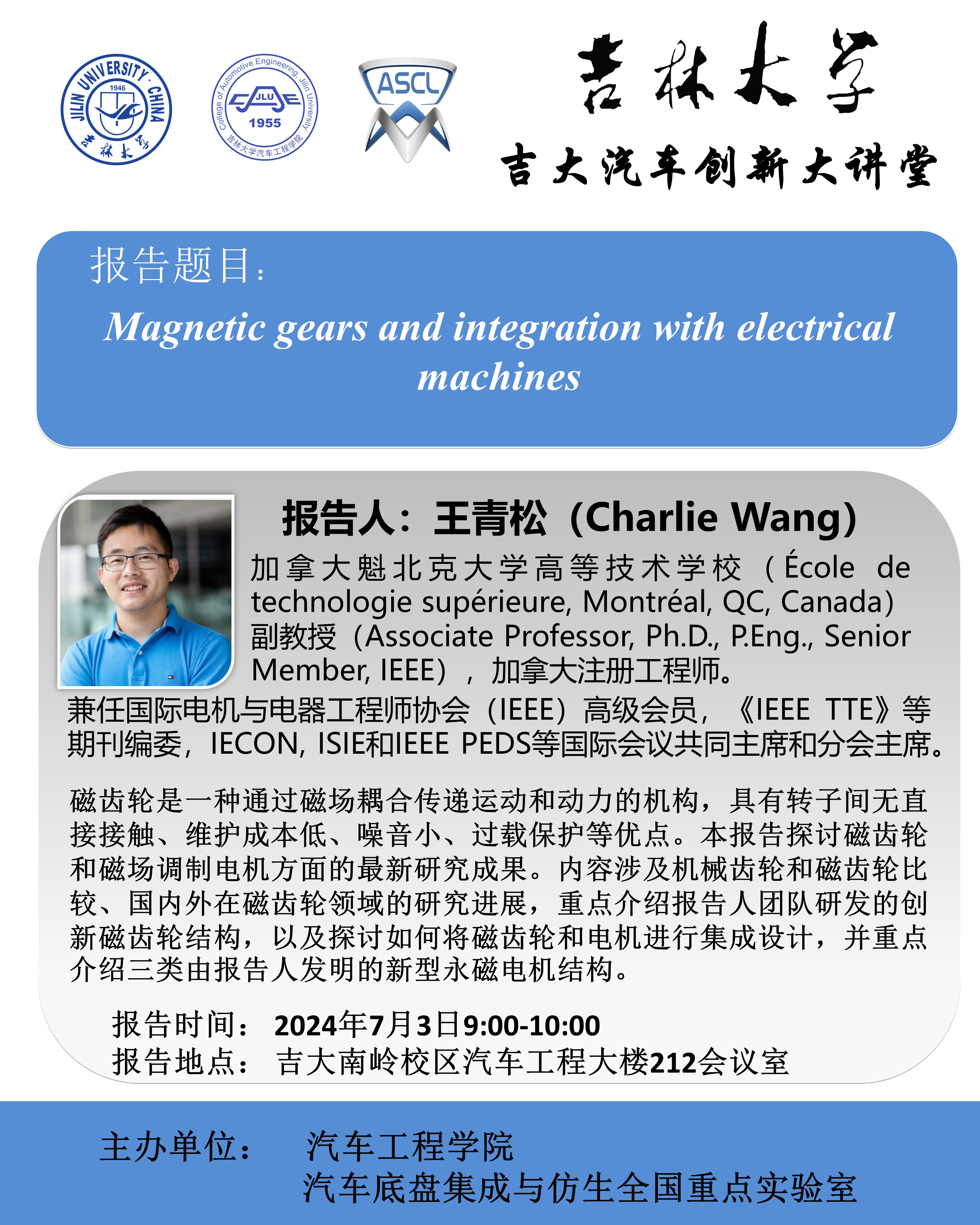 王青松博士简介:王青松博士是beat365官网2008级车辆工程专业本科生,2012年保送至同济大学攻读硕士学位,2015年至2018年在香港理工大学电气工程专业攻读博士学位。2019至2021年在英国考文垂大学先进低碳驱动研究中心担任讲师,现为加拿大魁北克大学高等技术学校副教授,加拿大注册工程师。王博士为国际电机与电器工程师协会(IEEE)高级会员、《IEEE TTE》等期刊编委,并担任IECON, ISIE和IEEE PEDS等国际会议的共同主席和分会主席。王博士在磁齿轮,磁场调制电机和无线充电领域取得了多项创新性成果。目前主持多项加拿大自然科学基金(NSERC)和魁北克自然科学基金(FRQNT)项目,在IEEE Trans. on Trans. Elect.,IEEE Trans. Ind. Electron., IEEE Trans. Magn., IEEE Trans. Power Electron.等国际SCI期刊和IEEE各类国际会议发表论文40余篇。