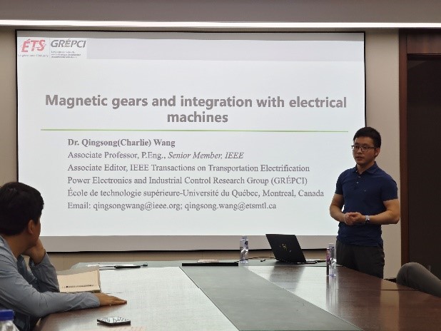 王青松博士为院内的研究生们作了题目为“Magnetic gears and integration with electrical machines”(磁齿轮及其与电机的集成)的精彩学术报告。该学术报告围绕磁齿轮和磁场调制电机方面基本原理、特点和工程应用以及国际上最新研究成果展开,内容涉及机械齿轮和磁齿轮比较、国内外在磁齿轮领域的研究进展,重点介绍报告人团队研发的创新磁齿轮结构,以及探讨如何将磁齿轮和电机进行集成设计,并重点介绍三类由报告人发明的新型永磁电机结构及其特点。与会教师王军年教授、袁新枚教授、赵迪博士后等师生代表与王青松博士就磁齿轮在汽车传动系统工程应用、磁电机仿真建模与控制进行了深入的交流。