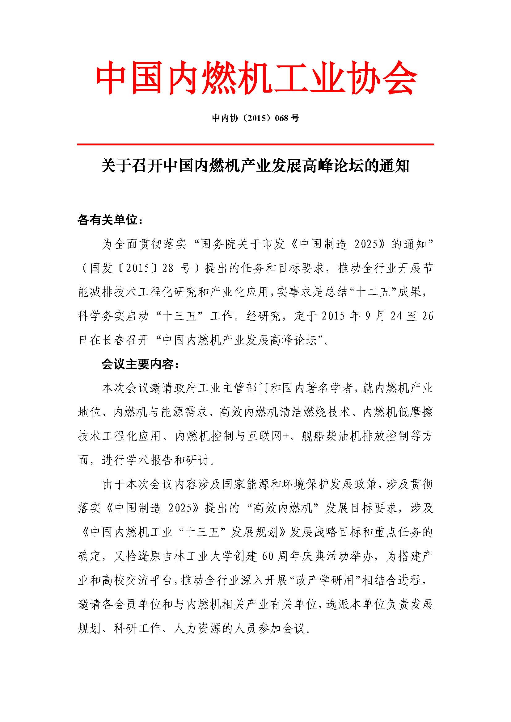 中内协(2015)068号 关于召开中国内燃机产业发展高峰论坛的通知