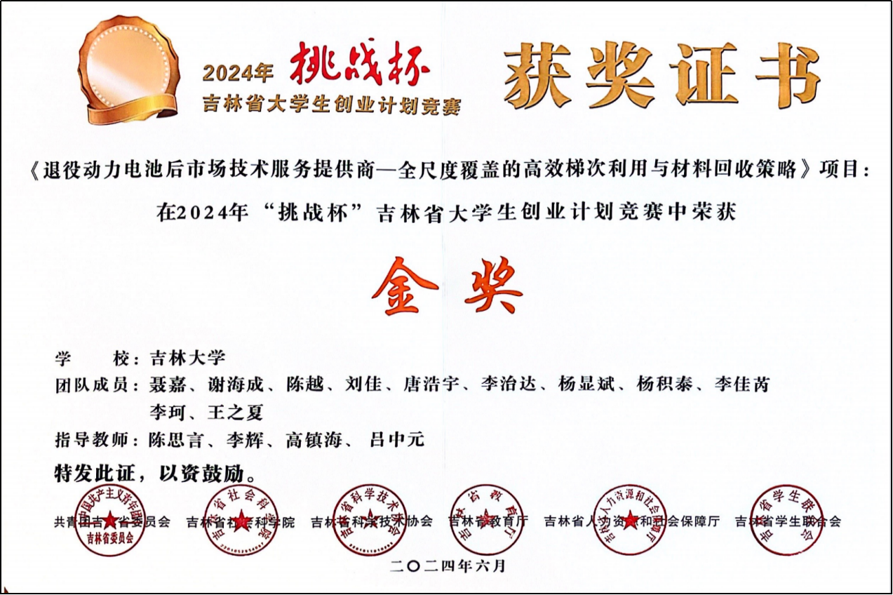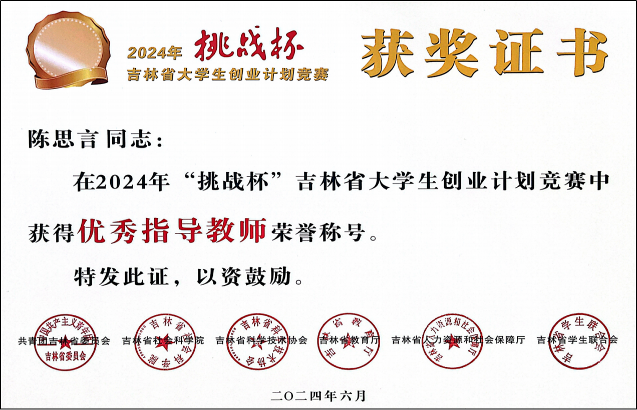 在学生指导与学科竞赛方面,指导研究生与本科生多次获得国家奖学金、学术业绩奖学金和本科生科研训练优秀项目。指导学生获得2024年“挑战杯”吉林省赛区金奖,全国赛区银奖(证书编号:220020015);2024年“中国国际大学生创新大赛”吉林省赛区金奖,全国赛区铜奖。