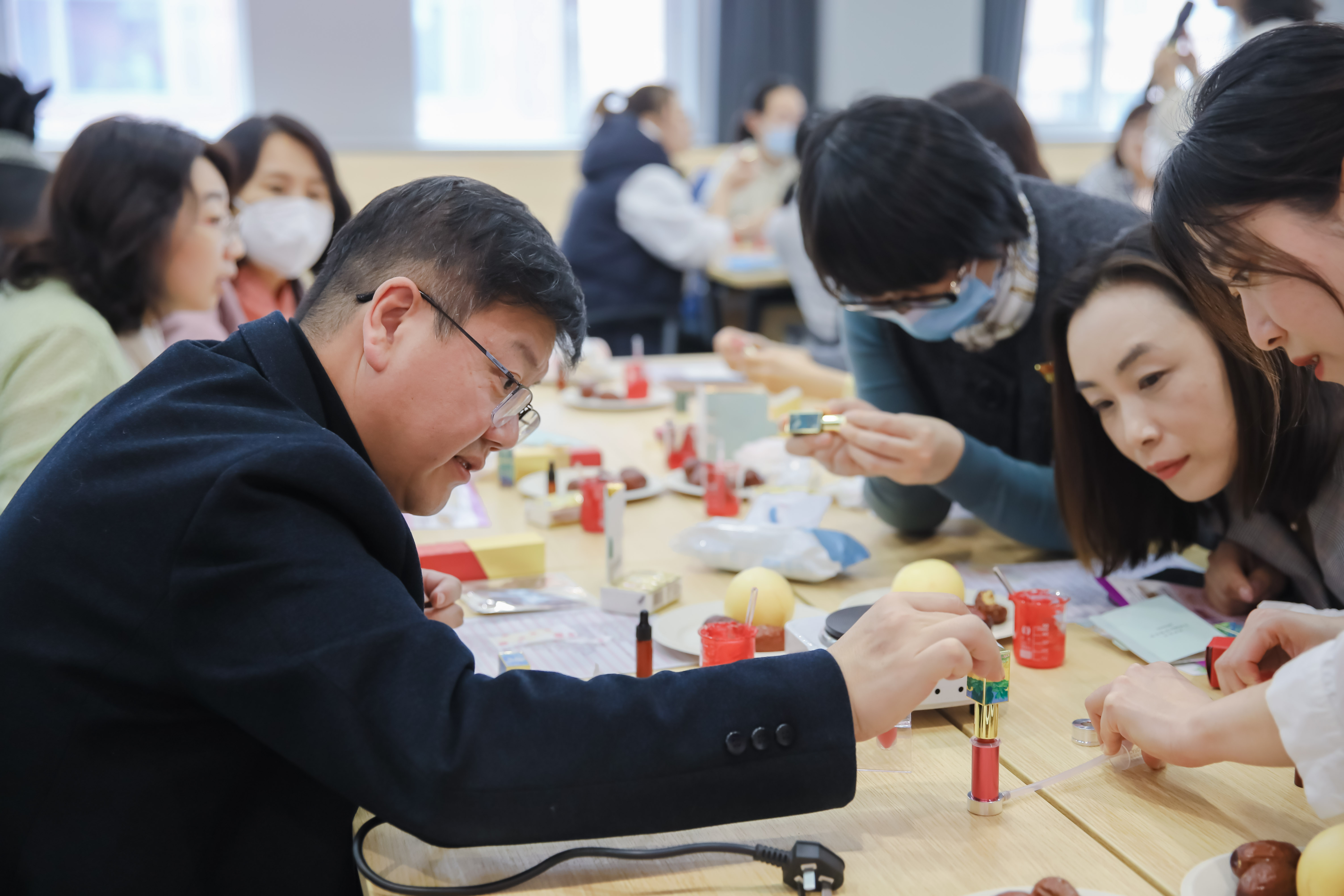 在芬芳舒适的氛围中,荣泽老师详细讲解了制作精油口红的操作要领,指导女教工们进行消毒、加热天然蜂蜡、融合色粉,随后灌装、凝固、脱模、安装。老师们认真得雕琢着自己的“作品”,同时互相帮助。最终,在大家的共同努力下,一支支精美的口红在一声声赞叹和一片片欢声笑语中制作而出。老师们纷纷试涂并拍照留念,美丽的脸庞娇艳如三月的朵朵桃花。